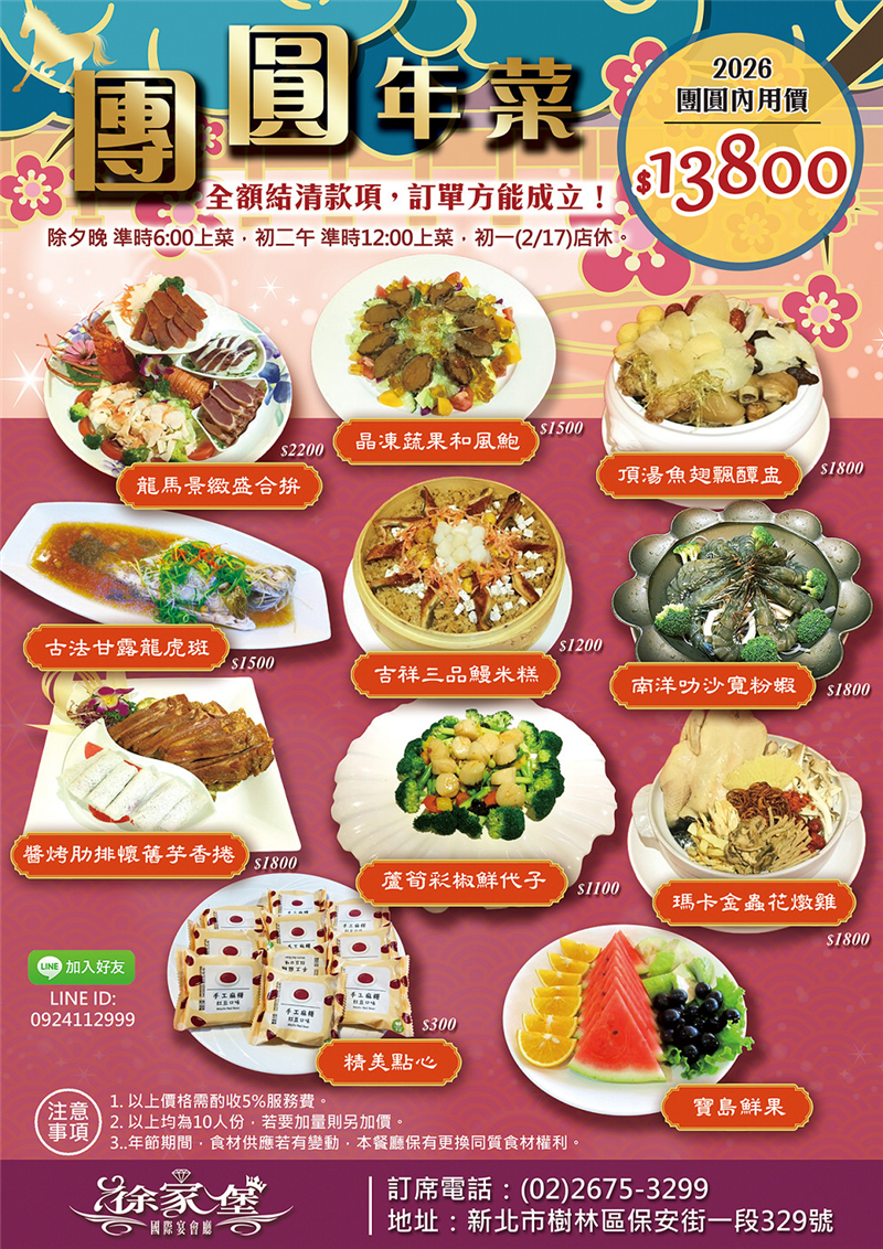 凡除夕圍爐時段每桌贈送飲料2瓶 請洽訂席組:02-2675-3299